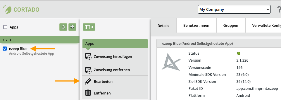 Hinweis! Wenn Sie ein Downgrade einer selbstgehosteten App durchführen möchten, müssen Sie die neue Version zuerst entfernen und danach die ältere Version der App neu installieren und verteilen. Ein Downgrade über den Bearbeiten-Button ist nicht möglich.