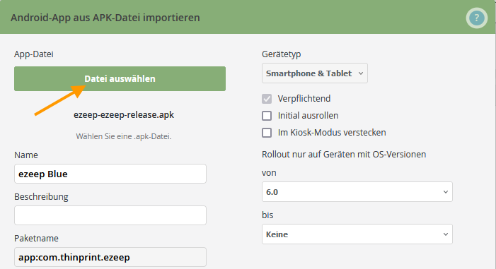 - Wählen Sie anschließend Ihre selbst entwickelte App (max. 500 MB, .apk-Datei) mit Klick auf Datei auswählen aus (Pfeil im Bild).